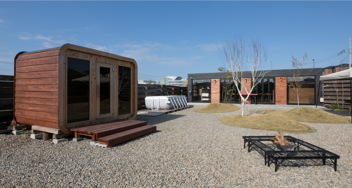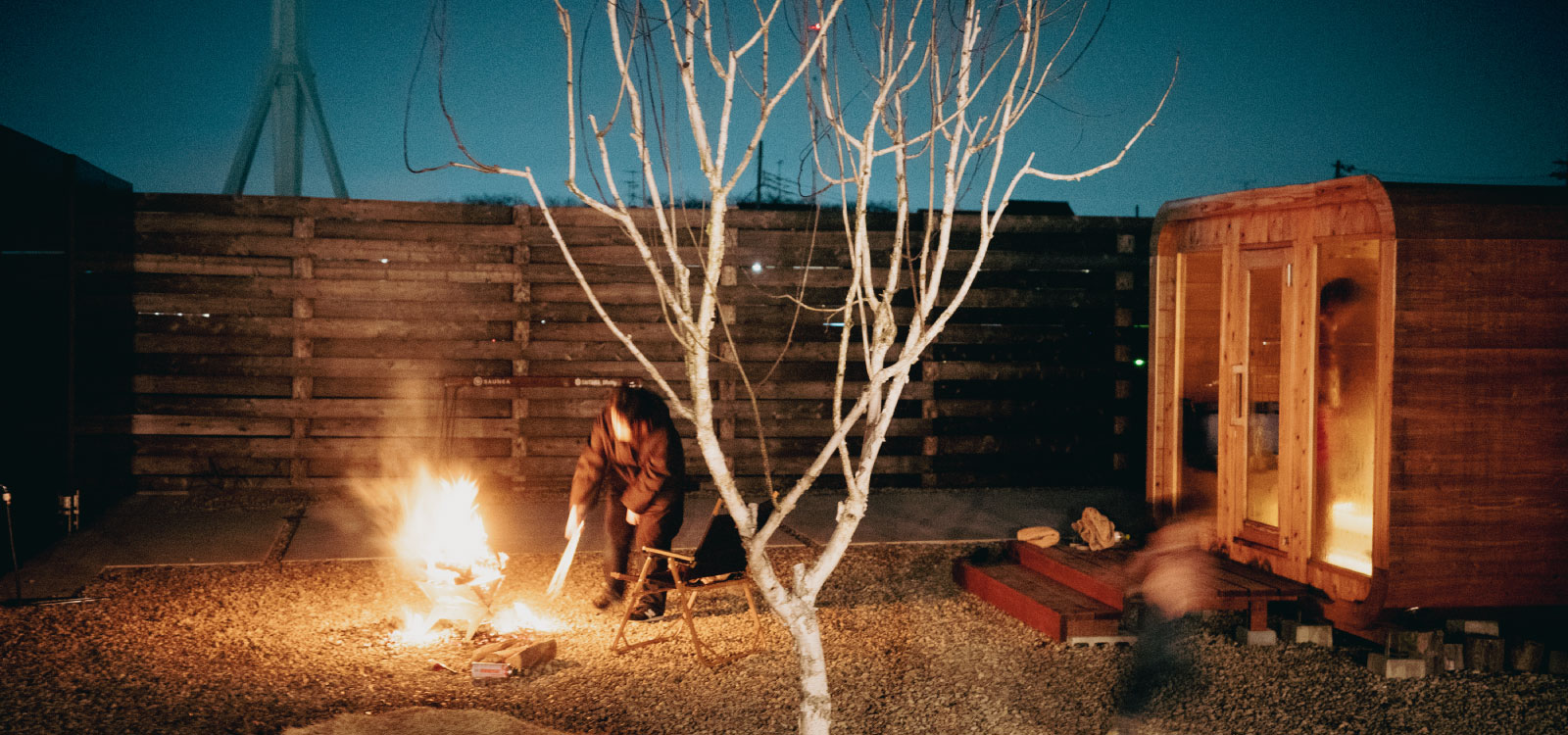 アウトドアの楽しみと言えば焚き火。“サウネアさいたま”では焚き火台も用意しており、気軽に焚き火を楽しむことができます。敷地全体が木製の壁に覆われているため、周りの目を気にせずにサウナもアウトドアも楽しめるようになっており、今回は持参しませんでしたがテントを張っての宿泊も可能。さいたま市という立地で星空の広がるキャンプを行うこともできるのです。