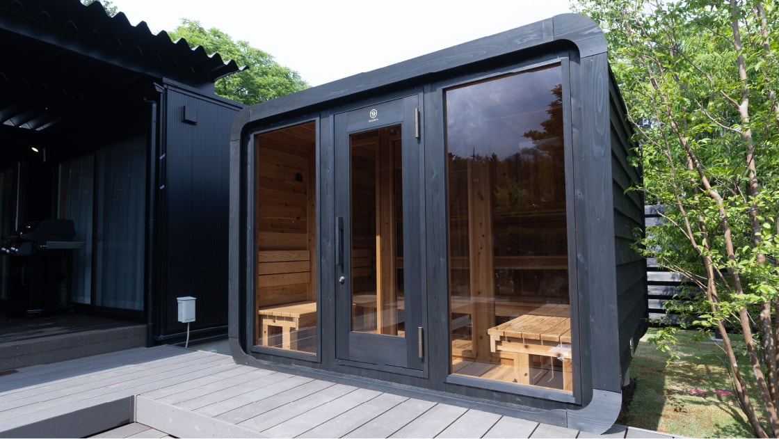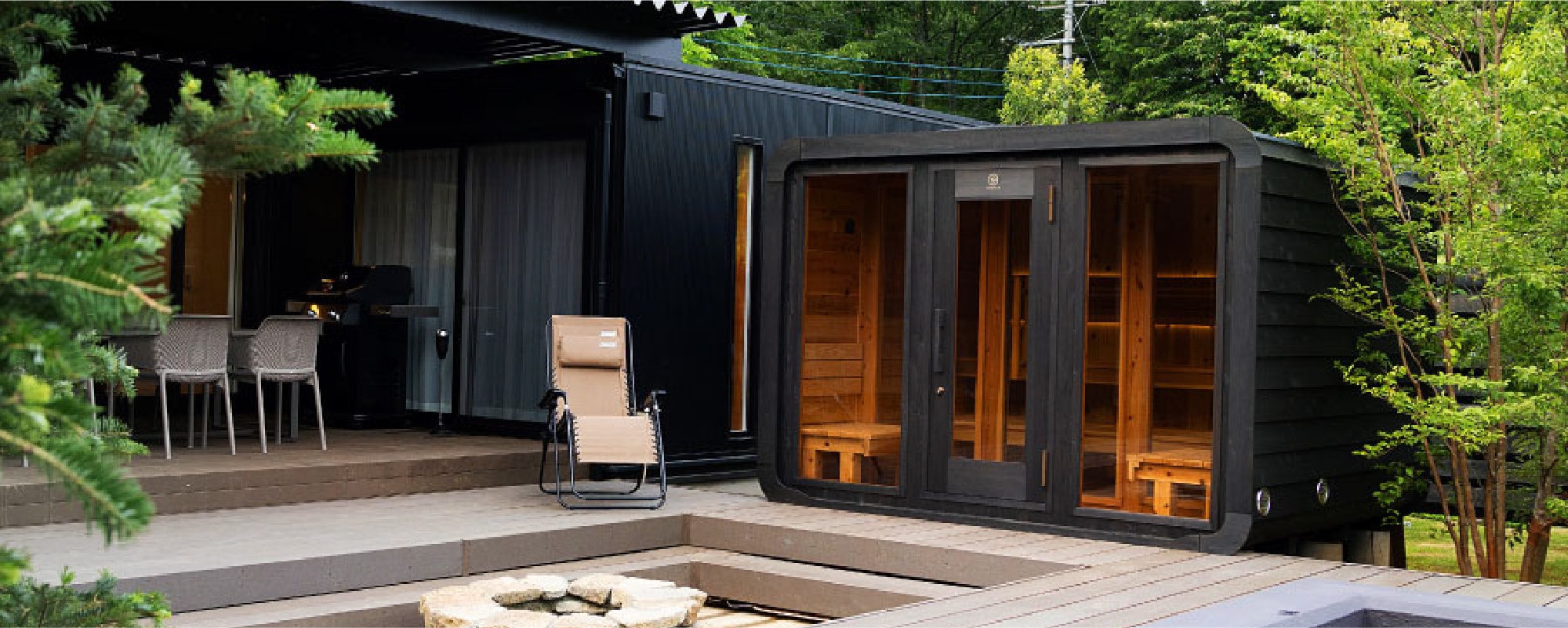 自然と一体になって屋外サウナを楽しめる、日本初の国産木材を使用したキューブ型デザインです。